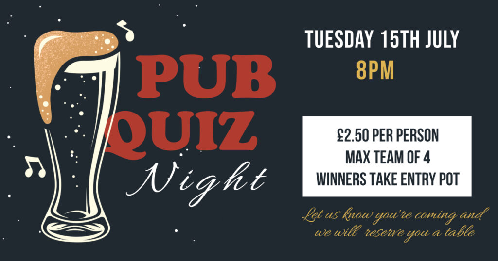 QUIZ NIGHT Come along to our Quiz Night on Tuesday 15th July with General Knowledge, Picture & Music Rounds. Let us know you’re coming along on the night. Share this: Share on X (Opens in new window) X Share on Facebook (Opens in new window) Facebook Post navigation Previous post DISCO with DJ ANDYNext post SOUL & MOTOWN DISCO
