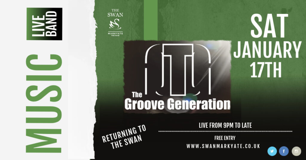 We welcome back THE GROOVE GENERATION to THE SWAN playing Classic & Contemporary Live Soul, Funk, RnB band guaranteed to fill the dance floor and create a great atmosphere with the sounds of Chic, Sister Sledge, Luther, Incognito, Stevie Wonder, Michael Jackson JOIN US FOR A GREAT NIGHT OF MUSIC!