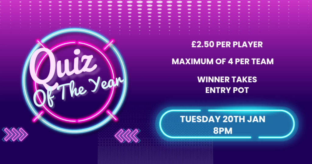 QUIZ OF THE YEAR Come along and test your knowledge of all that happened in 2025. £2.50 per person – maximum of 4 people per team. General knowledge round covering each month, picture and music round included. Share this: Share on X (Opens in new window) X Share on Facebook (Opens in new window) Facebook Post navigation Previous post CHRISTMAS ROCK AND ROLL BINGONext post LIVE MUSIC – THE GROOVE GENERATION