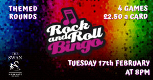 Rock & Roll Bingo returns for an evening of knowledge, luck and singing along Just let us know you are coming and who you will be sitting with and we can make sure we are ready for you. If you haven’t played before, instead of your boring old numbers being called out in a normal game of bingo, we’ve replaced them with 15-20 seconds bursts of the most toe-tappin’, bum wigglin’ sing along songs from the past and present! The numbers on the bingo cards have also been replaced with artists and song name. So with your bingo card in hand and your dabber on standby, listen out for the songs being played and mark them off as you would a normal game of bingo. It’s £2.50 per card and there are prizes for corners, line and full house
